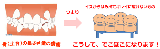 歯のでこぼこは、顎の大きさと歯の大きさの不調和によって起こります。歯は土台となる顎の骨に支えられています。この歯の大きさに対して、土台の大きさ・長さのバランスが小さいことによって、でこぼこが生じます。